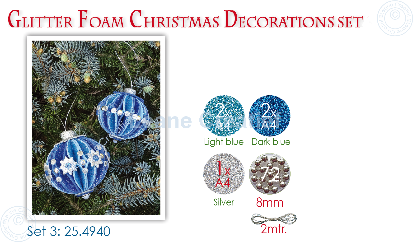 Glitter Foam Christmas Set 3. Für die Herstellung von 2 großen und 2 kleinen Weihnachtskugeln aus Glitzerschaum. Die Packung enthält das Muster zum manuellen Ausschneiden der verschiedenen Teile.