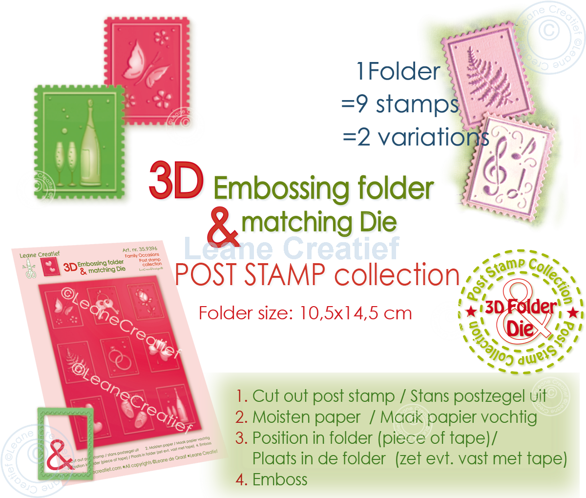 3D embossing folder 10,5x14,5cm, 9 verschillende postzegels 3x4cm