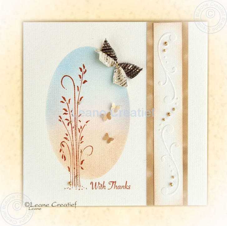 De achtergrond maak je met bijvoorbeeld Memento inkt. Knip een ovaal masker voor op de kaart en breng met sponsjes de zachte achtergrond aan.