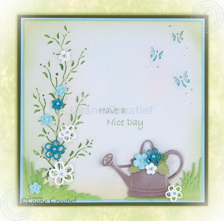 De embossingfolder van de tuin is een mooie achtergrond voor de gieter, het kruiwagentje het hekje en zelfs het mandje. Gebruik de kleine bloemetjes en blaadjes om het struikje aan te kleden....